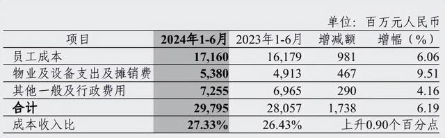 二,业务及管理费,达到近298亿元,同比增加17.38亿元,增幅6.19%,要明显高于当期总营业成本增幅2.34%。