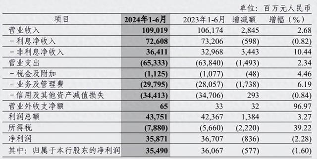 具体看,今年上半年,中信银行实现营收1090.19亿元,同比微增2.68%;净利润358.7亿元,同比下滑2.28%;归母净利润354.9亿元,同比下降1.6%;扣非后归母净利352.8亿元,同比下滑1.73%。