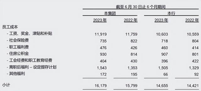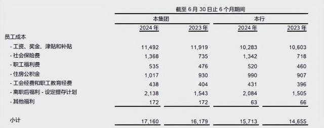 中信银行2024年中报附注提到,看今年上半年“员工成本”构成看,其中工资、奖金、津贴和补贴114.92亿元,同比减少4.13亿元,涉及本行同比减少3.2亿元,但社保费13.68亿元,同比增加6.33亿元,离职后福利-设定提存计划21.38亿元,同比增加5.95亿元。